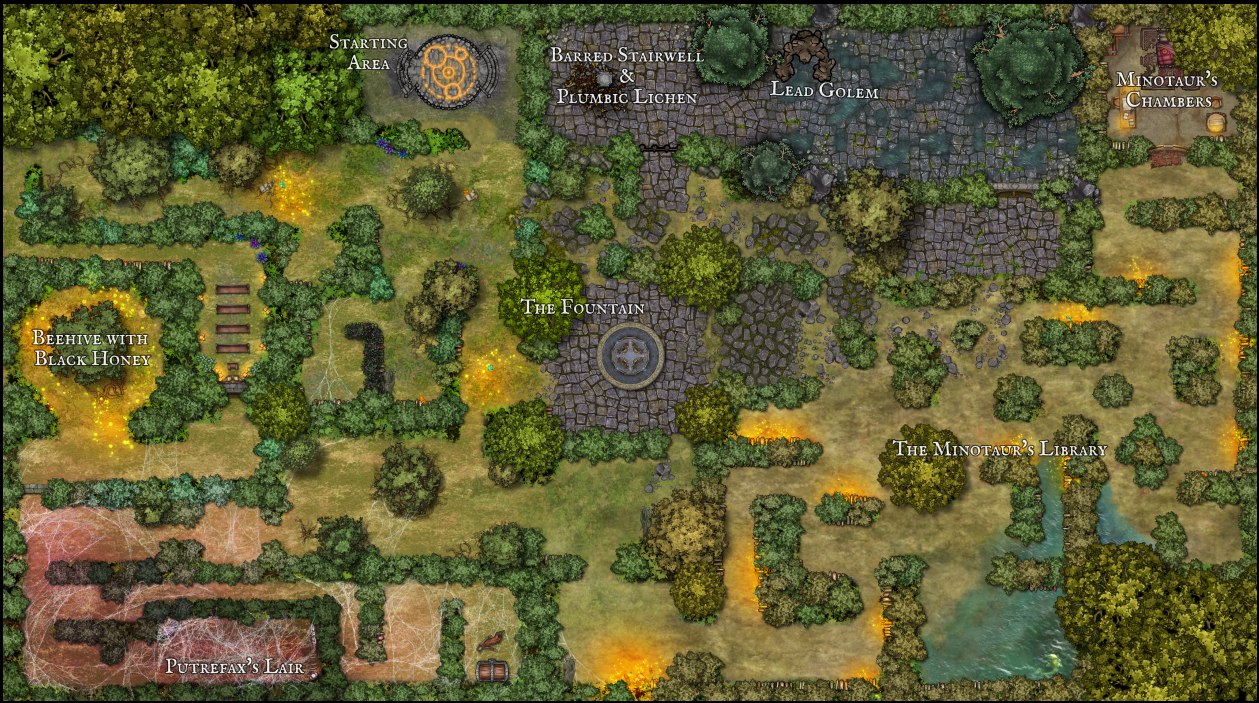 This is a garden level, which is the start of my Trials of Typhus megadungeon that I am making throughout 2026. I have simple stats for creatures (Health/Stamina/Mana, on a scale of 5), so you'll need to adjust to your particular flavor of TTRPG rules.